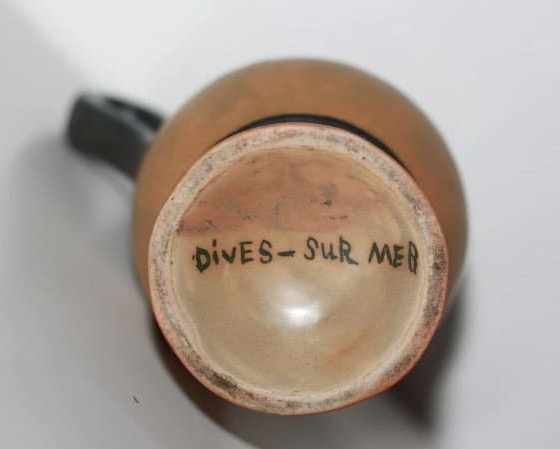 Un nouvel épisode de la série « Je découvre la France ». Cette fois c’est à Dives sur mer (Calvados) que l’on va poser nos bagages pour étudier ce pichet 369 – 1083 de 28 cm. Et là, même si l’on devine un grattage, en toute simplicité : DIVES-SUR-MER. Plus de HB, plus de QUIMPER, aucune indication de forme ni de décor; donc plus RIEN ! Oui, du HB DIVES SUR MER en quelque sorte !! Pourquoi ne pas mettre HB TOURISTE ?! A part cela, bel exemplaire de ce pichet.
